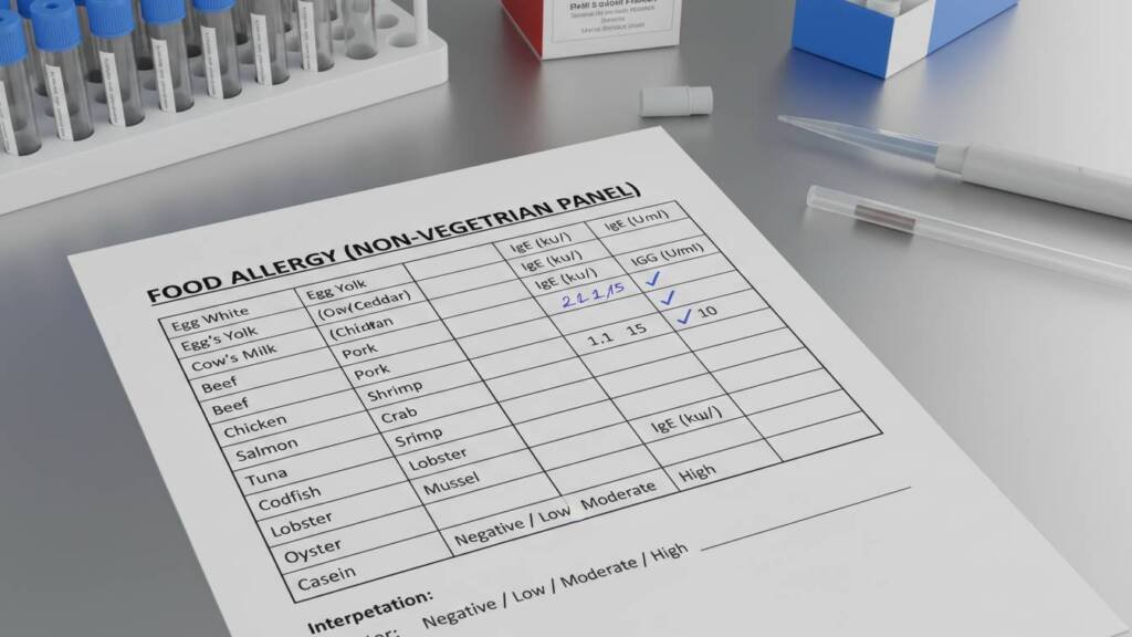 This test identifies allergic sensitivity to animal-based food products that may trigger reactions like hives, vomiting, diarrhea, or respiratory symptoms.